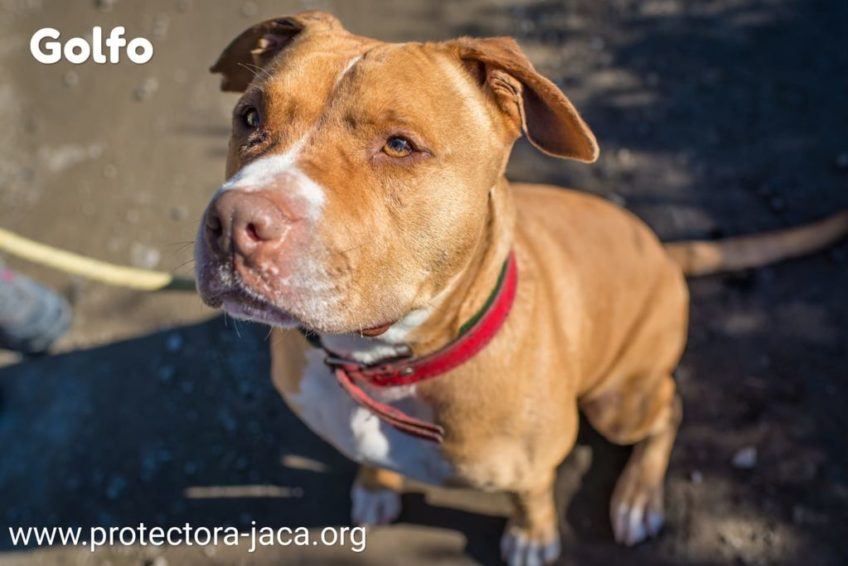 GOLFO llegó a nuestras instalaciones el 13 de octubre del 2016 como prueba de un delito, ya que fue decomisado en una pelea de perros en nuestra ciudad. Hasta ahora, un año después, no hemos logrado que la justicia nos lo cediese para buscarle un hogar, asegurarle, castrarle ya que en la legislación española aún los animales se consideran objetos… (Suerte que esto está cambiando).