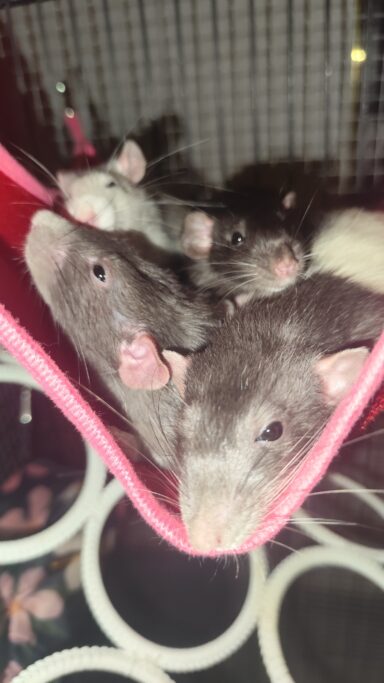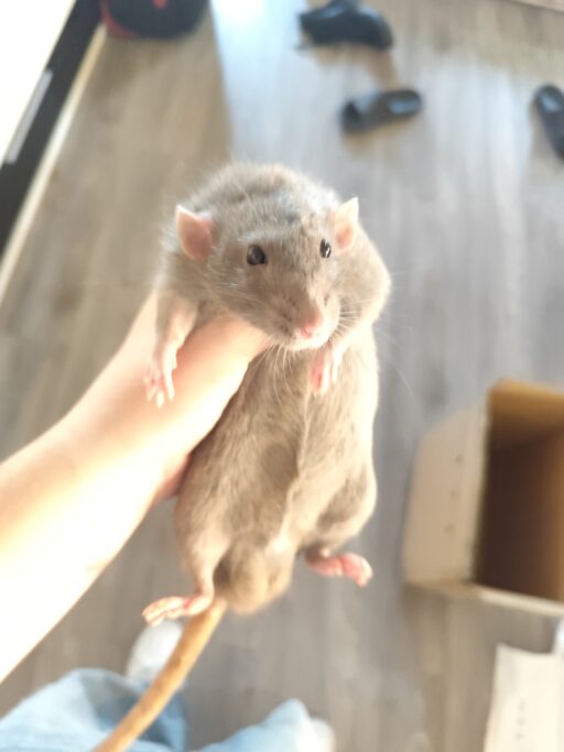 Piedra es una rata husky doméstica amigable y bastante curiosa. Estuve viviendo en Granada unos años y me sentía algo solo así que tuve la idea de adoptar un roedor, pero al terminar mis estudios tuve que volver a la casa de mis padres y creí que les gustaría pero todo lo contrario. Me quedaría